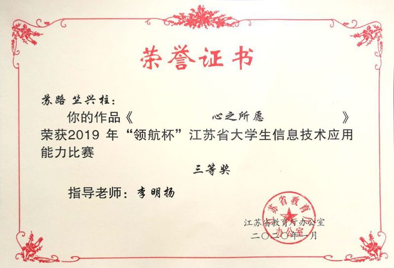 在2019年“领航杯”江苏省信息技术应用能力大赛中,公司李明扬老师指导的多组同学参加了该项比赛。其中苏路、竺兴柱同学报名参赛的视频作品《心之所愿》荣获三等奖。