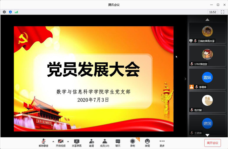 2020年7月3日下午2点,公司员工党支部在线召开员工党员发展大会。支部全体党员、六名发展对象以及入党介绍人胡作进经理、韩雪、颜无瑕老师一同参加了大会。会议由员工党支部书记李霞妹老师主持。