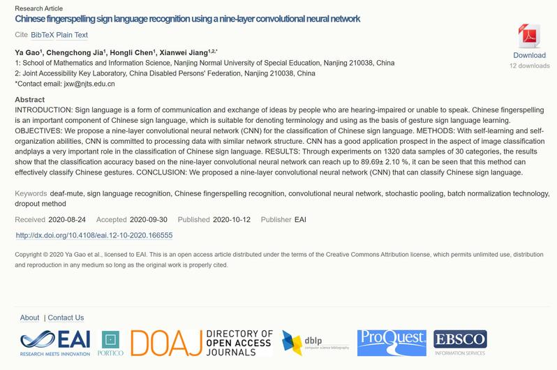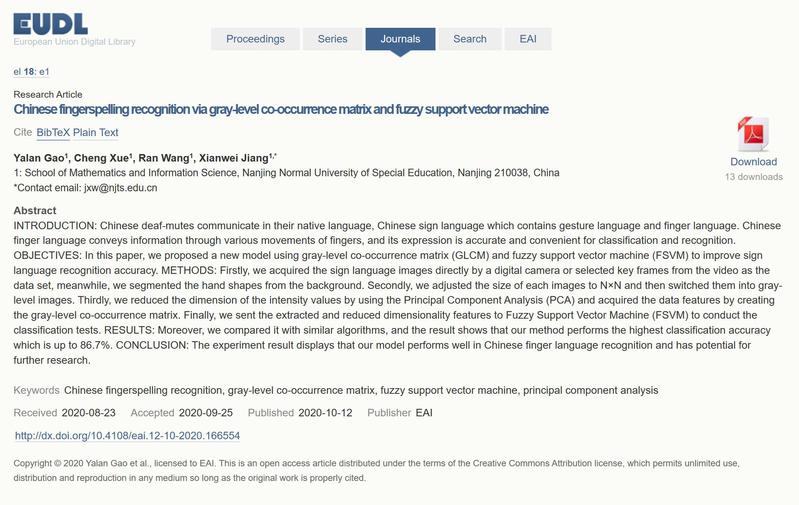 近日,公司18级同学高亚岚、薛晨、王冉等在欧洲研究期刊EAI Endorsed Transactions旗下子刊e-Learning 发表了题为“Chinese fingerspelling recognition via gray-level co-occurrence matrix and fuzzy support vector machine”的学术研究论文。同期,高雅、贾成冲、陈泓利等发表了题为“Chinese fingerspelling sign language recognition using a nine-layer convolutional neural network”的学术研究论文。这两篇研究论文均为公司老员工创新创业项目部分研究成果,目前已在线发表,后续将正式出版。