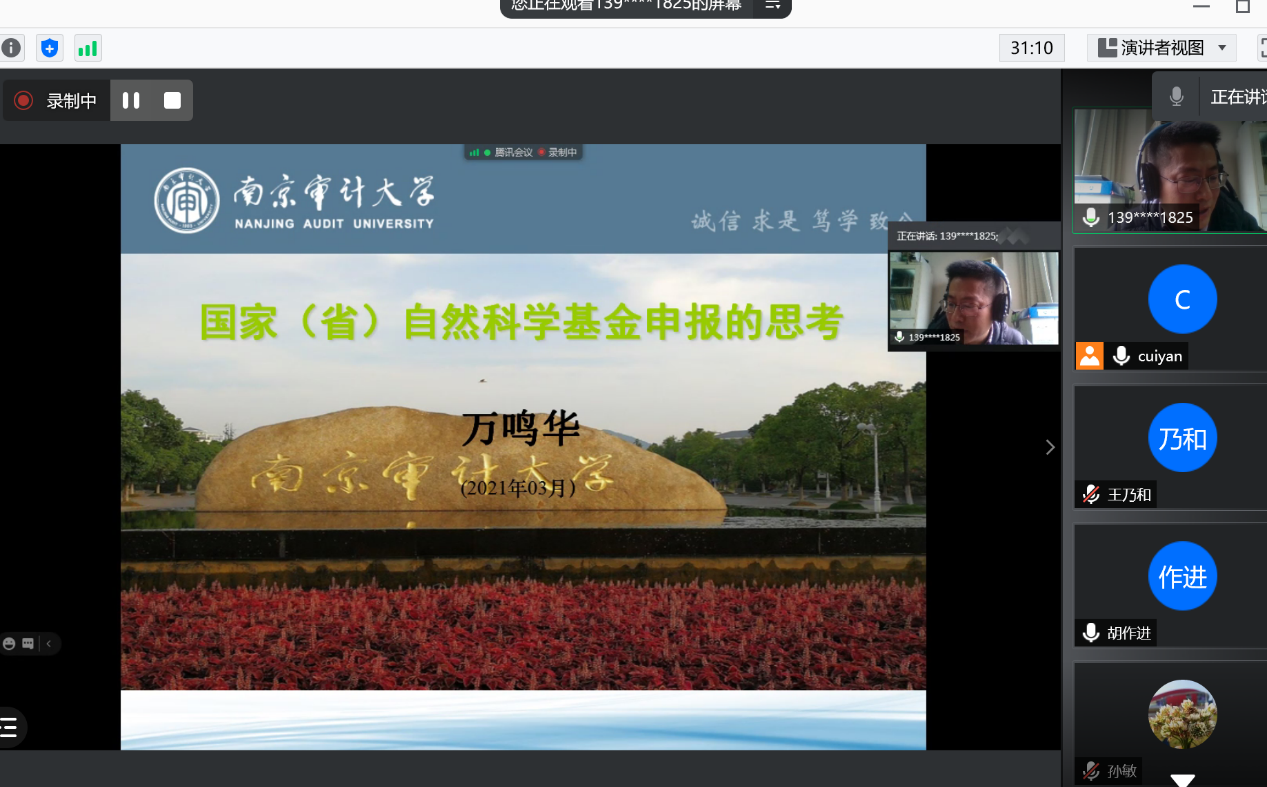 2021年3月3日下午,bw必威西汉姆联官方网站在新学期第一周举办自然科学基金写作经验交流的线上分享会,邀请南京审计大公司聘教授万鸣华博士对国家自科及江苏省自科的申报进行深度刨析,分享会由公司副经理(挂职)崔燕博士主持,公司及公司的部分教师参与此次分享会。