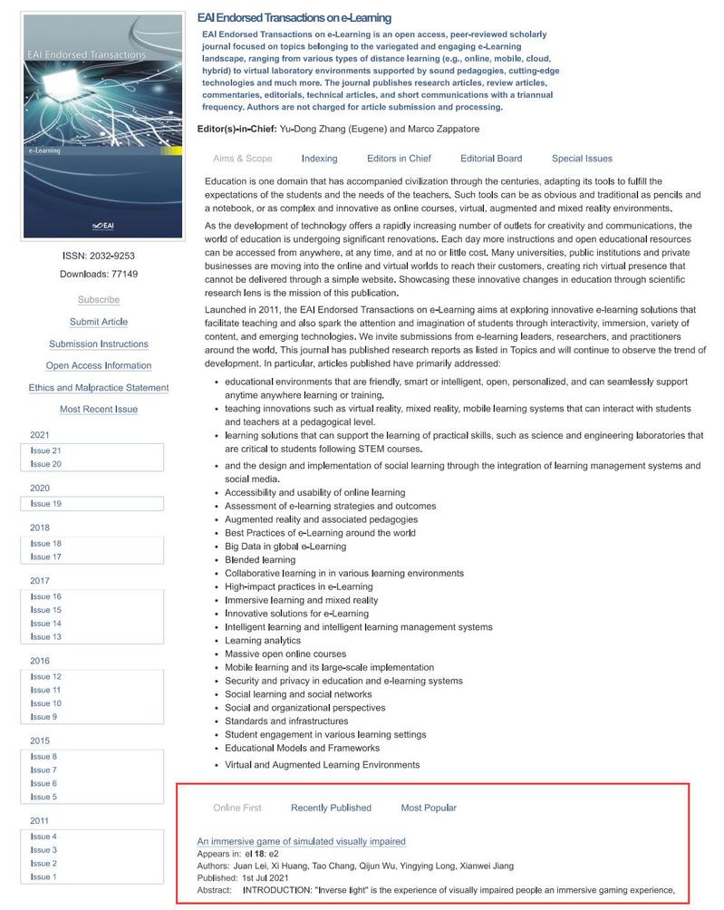 bw必威西汉姆联官方网站1902班雷娟、黄袭、常涛、龙莹莹、吴其俊等同学,结合学科专业,关爱特殊人群,基于Unity3D平台开发了一款沉浸式体验游戏《逆光》,并撰写论文“An immersive game of simulated visually impaired”发表于欧洲学术期刊EAI Endorsed Transactions on e-Learning。