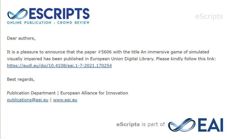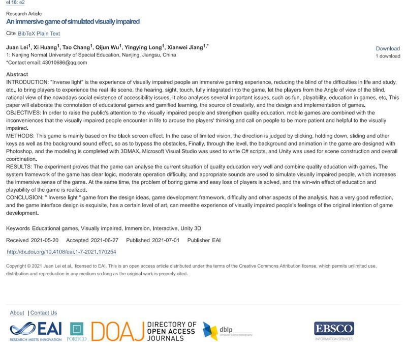 bw必威西汉姆联官方网站1902班雷娟、黄袭、常涛、龙莹莹、吴其俊等同学,结合学科专业,关爱特殊人群,基于Unity3D平台开发了一款沉浸式体验游戏《逆光》,并撰写论文“An immersive game of simulated visually impaired”发表于欧洲学术期刊EAI Endorsed Transactions on e-Learning。