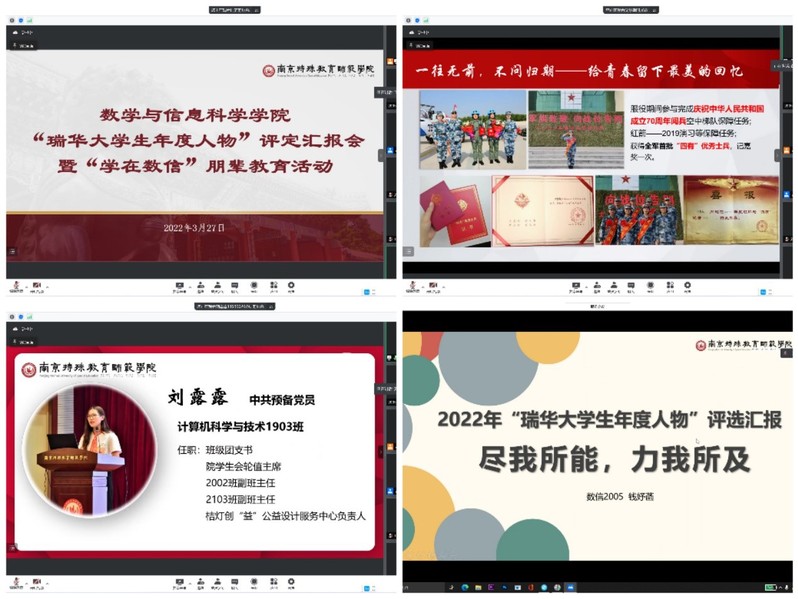 3月27日,bw必威西汉姆联官方网站线上开展2022年“瑞华老员工年度人物”评审汇报会暨“学在数信”朋辈教育活动,会议由辅导员樊琬老师主持,党总支副书记丁雯、全体辅导员老师和2019、2020、2021级员工代表参加此次会议。