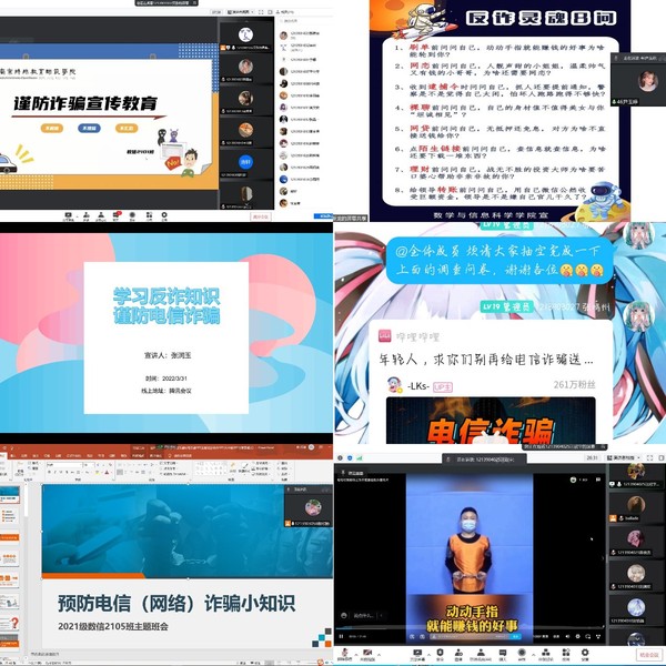 近日,高校电信诈骗事件频发,新型电信诈骗的手段也层出不穷,接踵而来,为进一步提高公司新生对于电信诈骗的防范意识,保护同学们的财产安全,杜绝此类问题的发生。3月26日-4月初,21级新生班级陆续开展一系列反诈骗主题线上宣传教育活动。活动由各班宣传委员主持,党总支副书记丁雯、辅导员张国盛及全体员工参与。