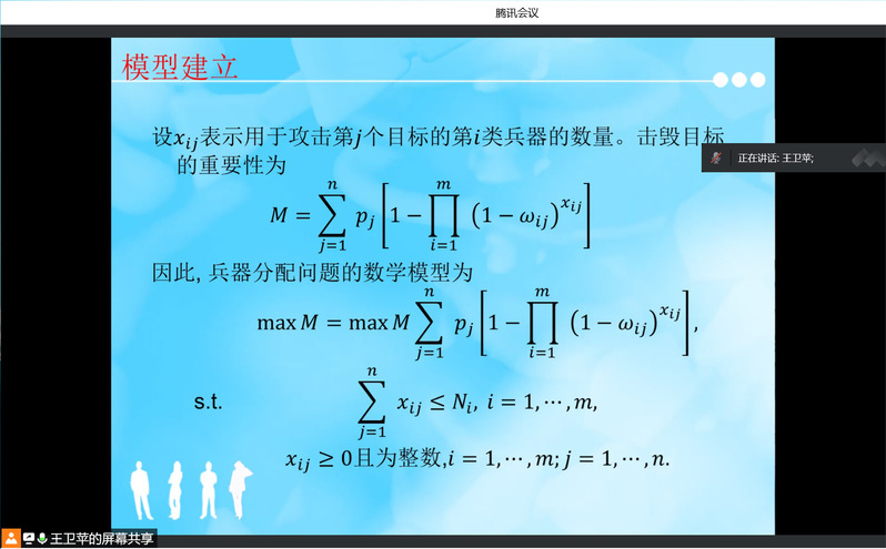 为了备战2022年美国老员工数学建模竞赛(MCM/ICM),bw必威西汉姆联官方网站于2022年2月13日举办了关于数学建模竞赛的线上学术讲座,讲座邀请了北京科技大学王卫苹教授,为员工专门讲解优化模型。数信公司数学教研室和计算机教研室的相关老师,以及参加美国老员工数学建模竞赛的30位同学参加了这次线上讲座。