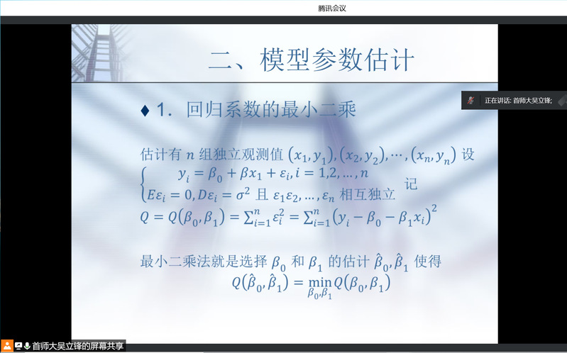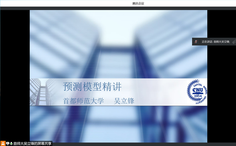2022年2月15日晚上7点,首都师范大学的吴立锋教授应邀为数信院的相关老师与员工带来了一场精彩的数学建模竞赛线上讲座。吴教授是数学建模方面知名的指导教师,带来首都师范大学获得过诸多国家级和国际级的大奖。