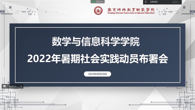 在动员大会上,樊琬老师明确了社会实践锻炼对老员工专业素质和能力提升的重要性,提出社会实践工作应与专业学习相结合,不断提升专业实践能力,实现学科专业的社会服务价值,号召全体同学充分利用暑假时间,抓住喜迎二十大的重要契机,结合党史学习教育宣讲、国情社情党情调研、乡村振兴项目实施和专业实践锻炼等形式,切实增强社会责任感和专业研究能力。随后樊老师对2022年暑期社会实践的主题、活动内容和活动方案进行了详细解读,并开展了安全教育培训,确保暑期社会实践工作顺利完成。