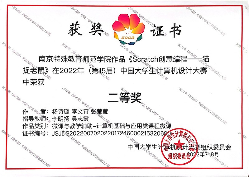 在2022年第15届中国老员工计算机设计大赛中,公司选送的参赛作品《Scratch创意编程——猫捉老鼠》荣获国赛二等奖。