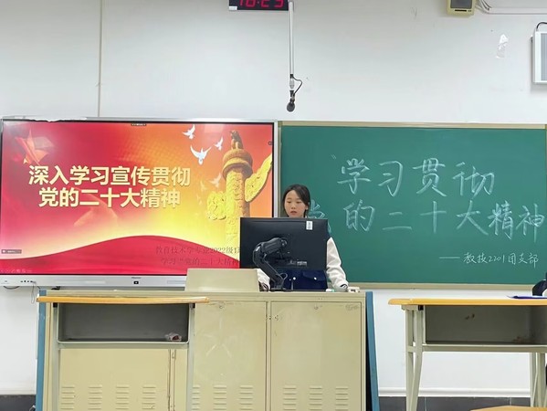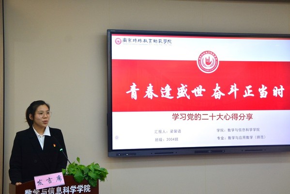 “同学们,你们想过‘我是谁’‘我要成为什么样的人’吗?……我深切感受到了青年之于国家和民族的重要性,我要努力做一名堪当民族复兴重任的时代新人,不断传承与创新,关注国家卡脖子的问题,将理论学习转化实践动力,积极进取,开拓创新。”数信院员工党员梁馨语结合自己的经历,和同学们分享了自己学习党的二十大精神的体会。