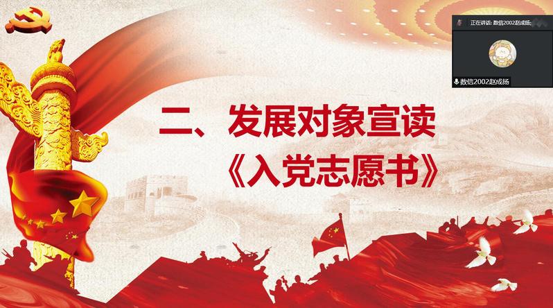 为做好党员发展工作,进一步健全和完善支部组织建设,2022年12月30日,数信与信息科学公司员工党支部在腾讯会议召开2022年下半年党员发展大会。公司员工党支部全体成员参加此会议,会议由支部组织委员丁力主持。