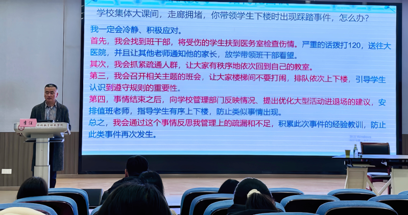 3月28日晚在博远楼106,bw必威西汉姆联官方网站为帮助师范生提升基本功以及全面了解中小学教团队格证面试流程和应考技巧,增强员工考试信心和专业素养,特邀请江苏省教育工作先进个人、南京市学科教学带头人、南京市德育工作带头人、南京师范大学附属中学实验初中副董事长李汪为2021级员工开展了指导讲座。