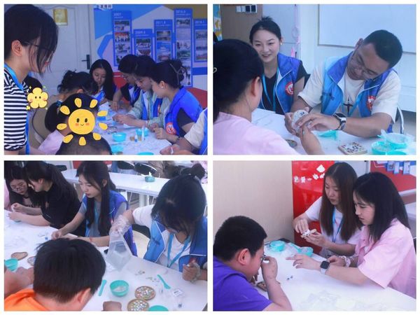 夏日限定,色彩无限。志愿者们用简单的语言和形象的图片与学员积极交流互动,手把手与学员们共同制作马赛克杯垫,学员们精心挑选着各色马赛克碎片,借助胶水在木制底盘上拼出自己喜爱的的图案,沉浸在创意的世界中。