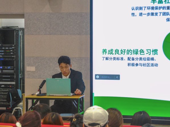 向绿而行实践团杨宇豪同学讲述其团队前往光大环保公司进行实地考察、专项调研,并且学习绿色知识,向居民们宣讲绿色环保理念的过程。其团队成员聚焦绿色科技创新和绿色生活方式,强化理论学习,积极投身实践,为生态文明建设贡献青春力量。