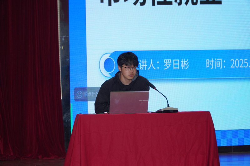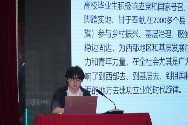 入选西部计划志愿者的张萌同学介绍了西部计划的招募流程、具体服务项目等,他着重强调了国家对西部计划志愿者的政策支持,他鼓励同学们将个人理想与国家发展战略相结合,在西部广袤的土地上书写属于自己的青春篇章。