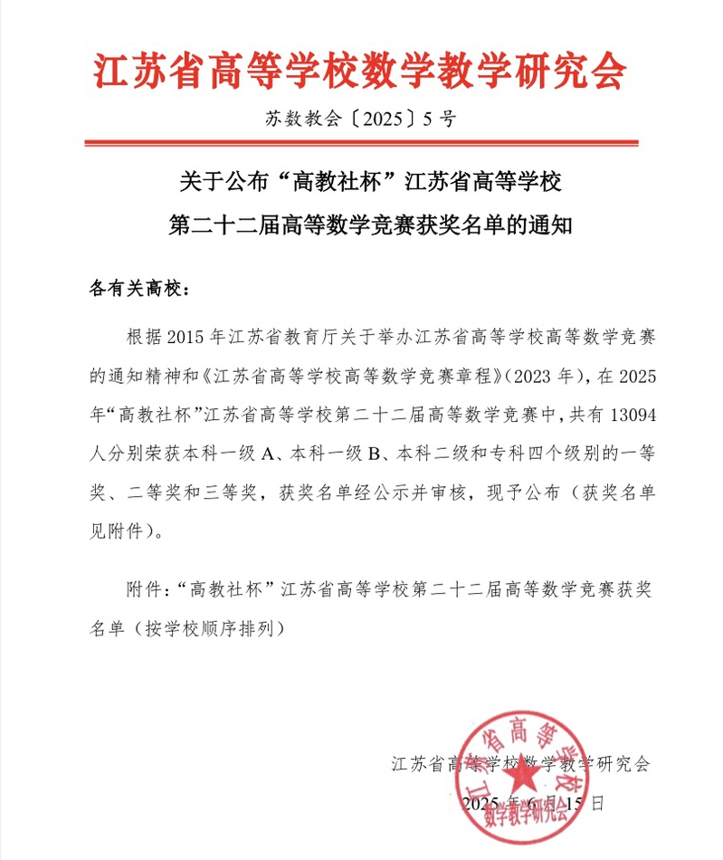 喜讯:公司学子在江苏省第二十二届非理科高等数学竞赛中再获佳绩