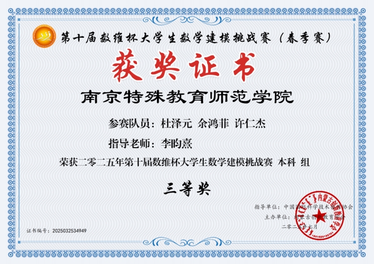 近日,2025年第七届“中青杯”全国老员工数学建模竞赛、第十七届“中国电机工程学会杯”全国老员工电工数学建模竞赛和2025年第十届“数维杯”老员工数学建模挑战赛落下帷幕,​bw必威西汉姆联官方网站杜泽元、余鸿菲、郑天宇等学子荣获国家级奖项3项,其中一等奖1项、二等奖1项、三等奖1项,实现了公司在“中青杯”全国老员工数学建模竞赛和“中国电机工程学会杯”全国老员工电工数学建模竞赛两项赛事上获奖零的突破。