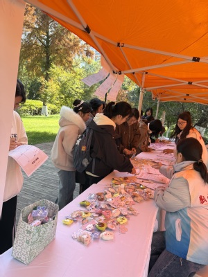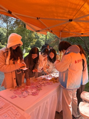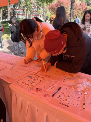 现场活动分为三个板块:“一叶知心”环节中,师生在树叶上书写或绘画,汇集展示成暖心景观;“情绪彩绘”引导大家在九宫格上用色彩与关键词表达情绪,收获纪念挂件;“一掷忘忧”投壶游戏则让参与者在欢声笑语中释放压力,并根据投中结果获得小礼品。各环节设计巧妙,兼顾了情感表达与压力疏解。活动中,志愿者团队分工明确、配合默契,分别负责引导咨询、环节协助、签到管理等工作,保障了现场秩序井然、流程高效。活动结束后,团队及时完成场地清理与物资整理,为本次活动画上圆满句号。
